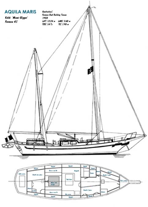 Aquila Maris est un « Formosa ». Il fait partie de ces ketchs construits à Taiwan pour les USA, dont quelques exemplaires seront vendus en France.