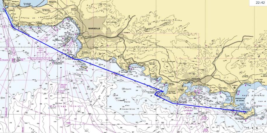 Après les îles de Marseille, le vent monte à 20 nœuds, toujours d’Ouest. La voilure est établie au vent arrière avec un cap vers la côte, ce qui nous obligera à empanner pour entrer aux Embiez.