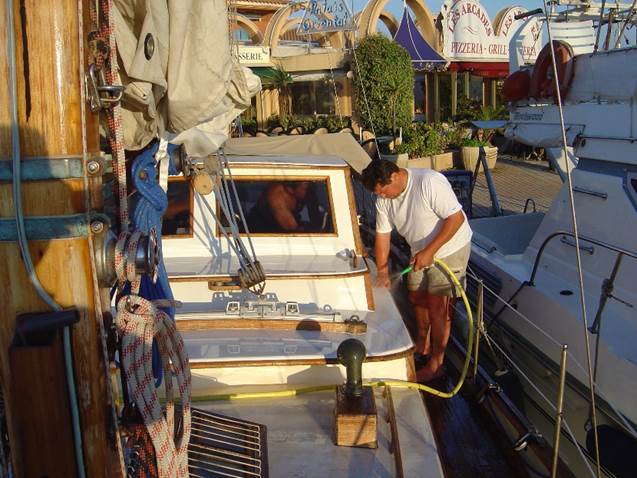 Arrivés aux Embiez, il y a tout : un poste à quai sympa, il fait beau (ouest de Sicié), on est bien accueillis, il y a du citron vert à bord et un restaurant de grillades sympa à terre.