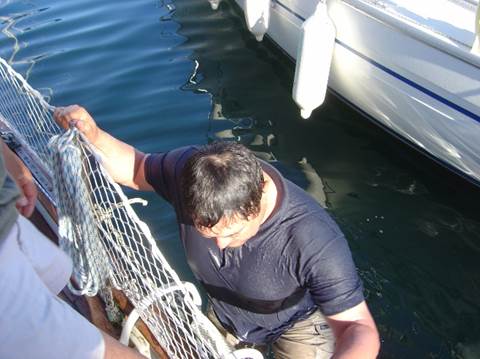 Juste avant l’appareillage, en effet, Espadon décide d’un dernier bain avec chaussures, portefeuille et… les croissants qu’il était allé chercher pour nous.