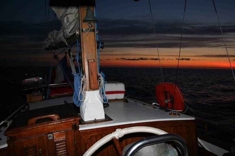 Avec un vent venant de l’avant bâbord, je préfère rester au moteur cette nuit pour éviter des manœuvres de voiles dans le noir, les prises de ris dans la grand-voile étant assez délicates.