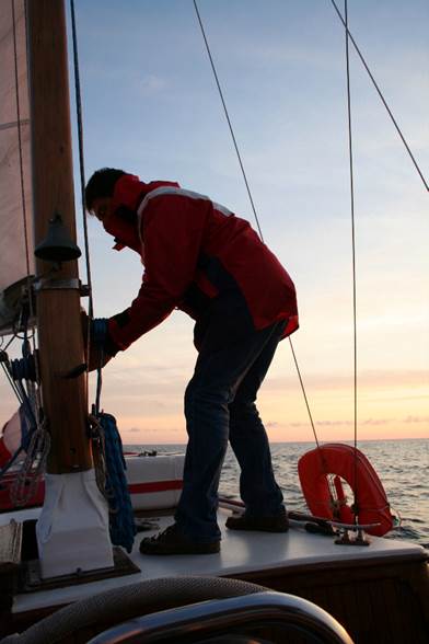 05.30. Le vent est passé au sud-est à 10 nœuds : tandis que le soleil se lève, je mets à la voile.