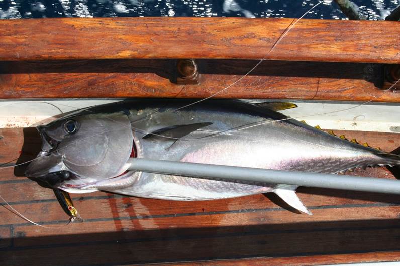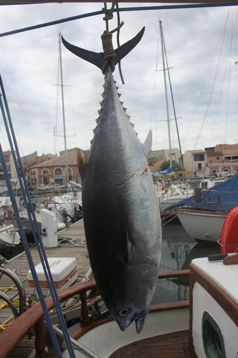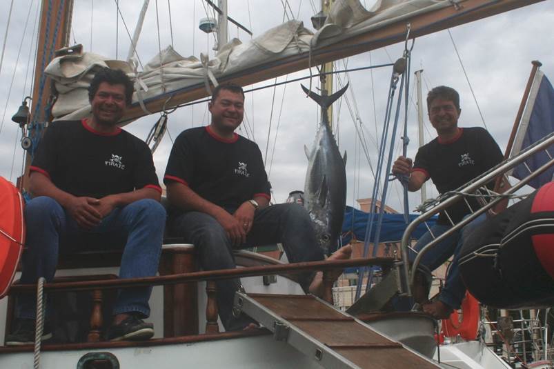 En regardant dans le sillage et les vagues qui font surfer Aquila, nous voyons une marque noire à 400 mètres derrière nous. Nous hâlons la ligne, et remontons un thon de 20 kgs à la gaffe sur le pont. La marque noire, c’était la gueule ouverte du thon, noyé.