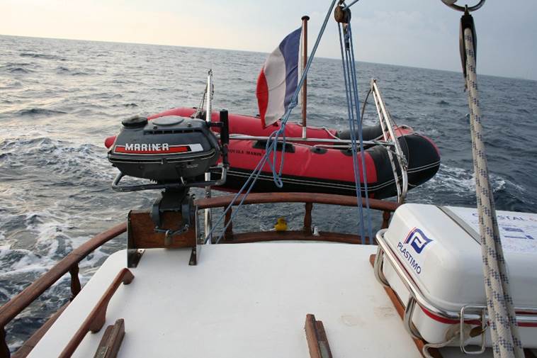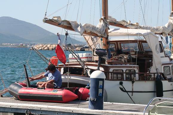 Nous profitons de ce temps à quai pour réparer l’annexe. C’est Espadon qui s’y colle.