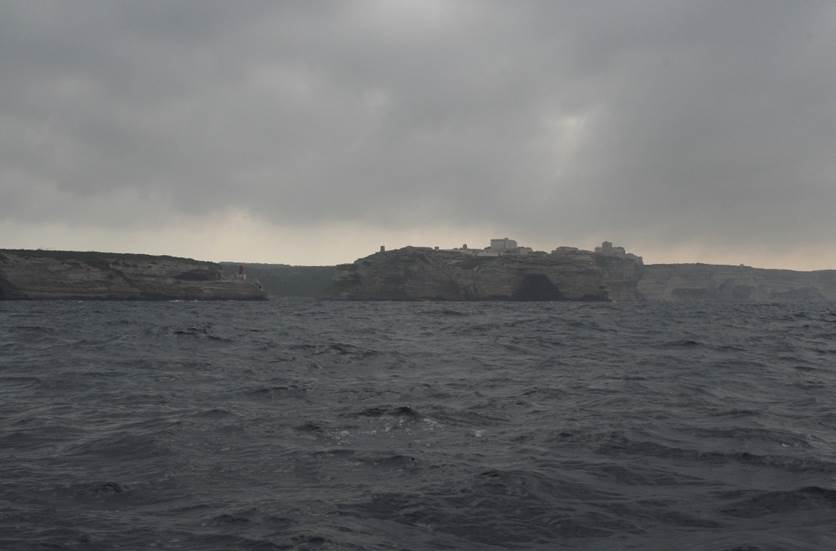 Nous sommes devant Bonifacio. Le temps a été pourri pendant toute la traversée, et nous sommes heureux d’arriver, sans panne moteur qui plus est.