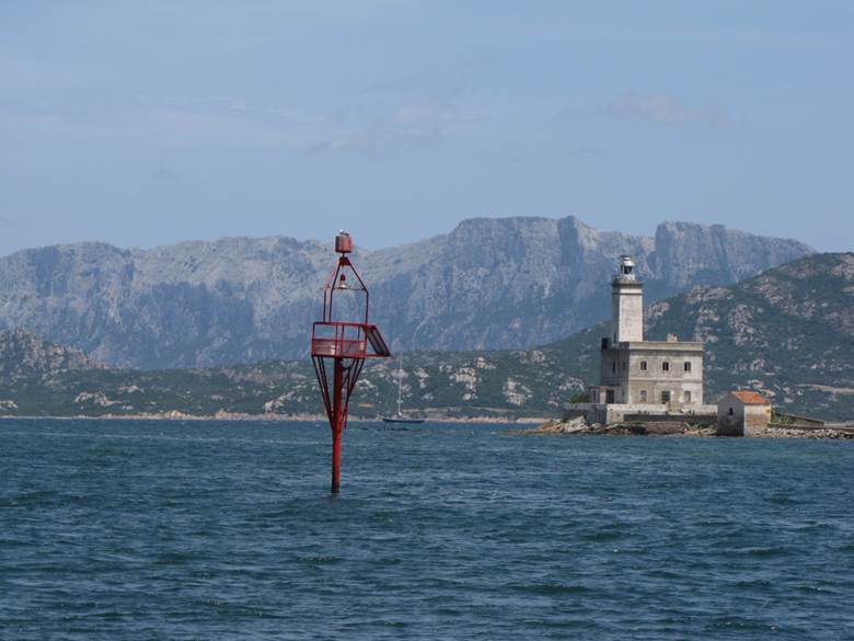 Chenalage de sortie vers le phare Della Bocca et l’île Tavolara en fond de paysage