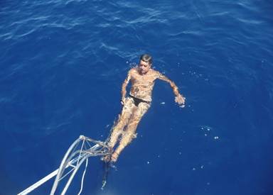 Et comme il est content, il arrête le bateau au beau milieu et saute à l’eau…