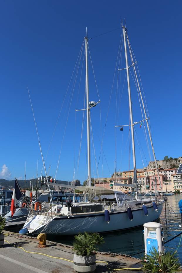 Nous appareillons du calme mouillage du fond de la baie de Portoferraio et, après avoir franchi l’impressionnante tour de garde du port, nous sommes accueillis par l’ormeggiatore de service, professionnel et efficace.