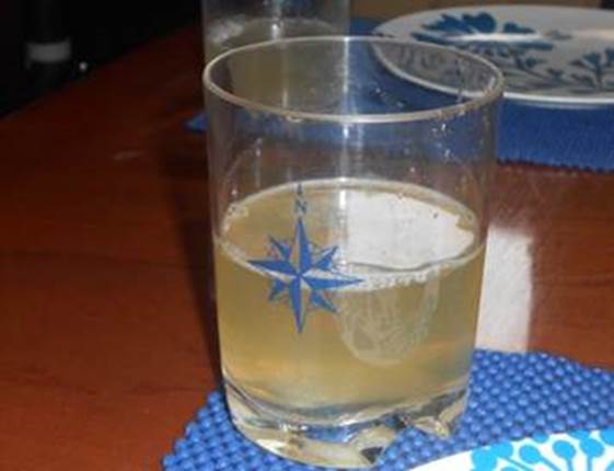 Pour se consoler de pas voir le cap’tain du port, un bon p’tit déj’ qui donne des forces : composé de croissants, de pains au choc’… et comme faute de grive on mange des merles ; faute de jus de fruits, on boit du jus de citron jaune…