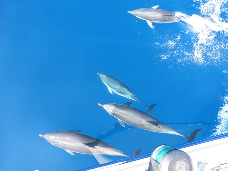 Au petit matin, alors que le « patron » roupille comme un bienheureux, nous avons le privilège de vivre une rencontre inoubliable avec une bande de 5 potes aquatiques qui viennent jouer pendant un bon quart d’heure avec notre étrave ; GoPro et appareil photo immortalisent cette rencontre magique dans une eau cristalline.