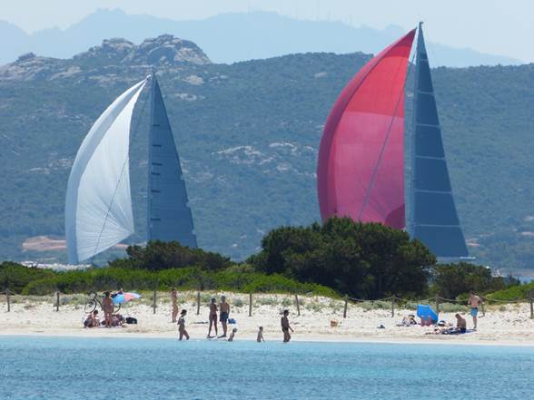 Autre pestacle magique dans l’après-midi : une régate de maxis (le plus minable doit bien faire ses 70’) qui déboulent sous spis monstrueux derrière la plage. Avec Celle-fiche nous en restons babas.
