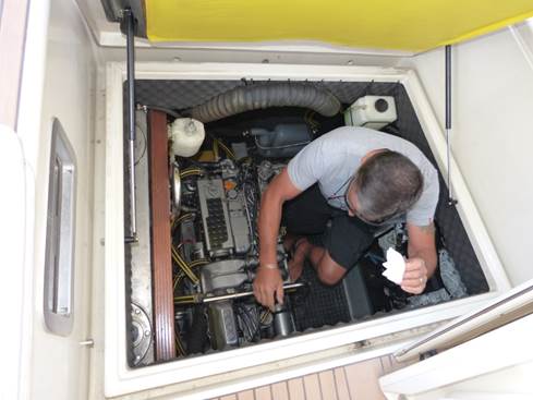 Réveil comme prévu à 7h3O et préparatifs du départ à suivre. Capot-Sud, en mécanicien aguerri, ne déroge pas à la règle et fait ses contrôles moteur (après avoir relevé ledit capot) avant le départ malgré le petit trajet qui nous attend (30 milles environ).