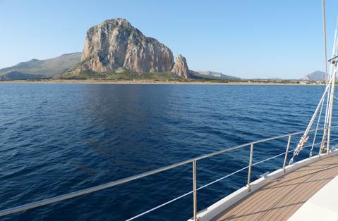 Franchi les passes vers 08h00 et nous cinglons au moteur vers Palerme ; dernier coup d’œil à l’imposant rocher qui domine la station balnéaire de San Vito.