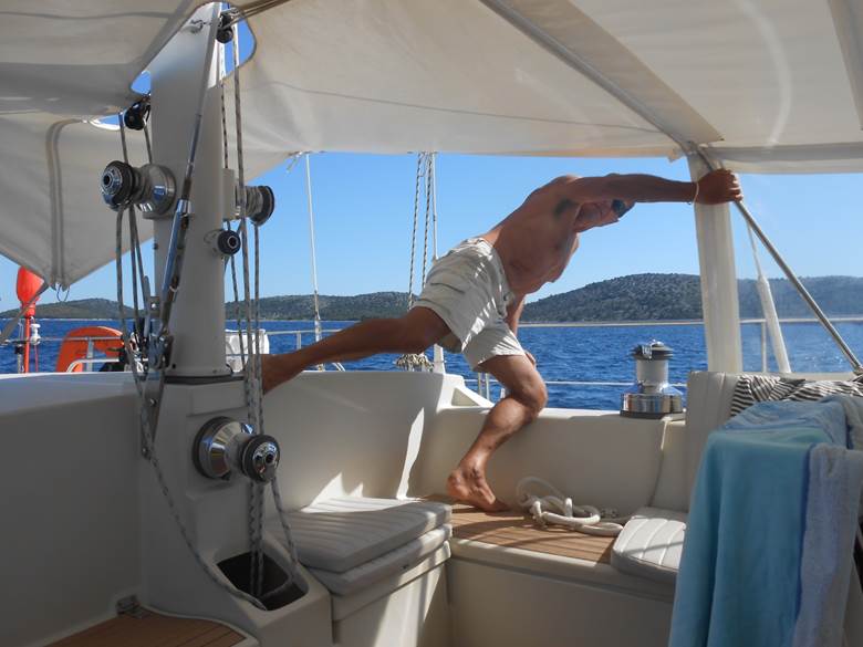 …oui vraiment jouer… vous noterez ce magnifique side-kick acquis après de nombreuses années de karaté, tout cela pour activer le winch de grand-voile !