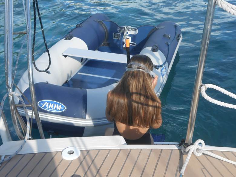 Elle finit, on ne peut pas la tenir éloignée de l’eau bien longtemps, par accompagner Cap au Sud pour un petit tour en annexe, à la rame.