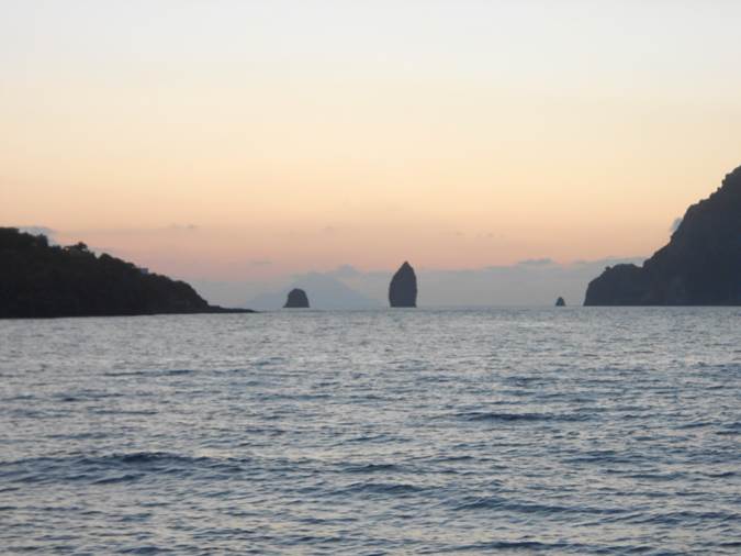 Demain matin, nous arriverons à Palerme. Mais il y a eu un beau coucher de soleil derrière des pics volcaniques sortis de la mer !