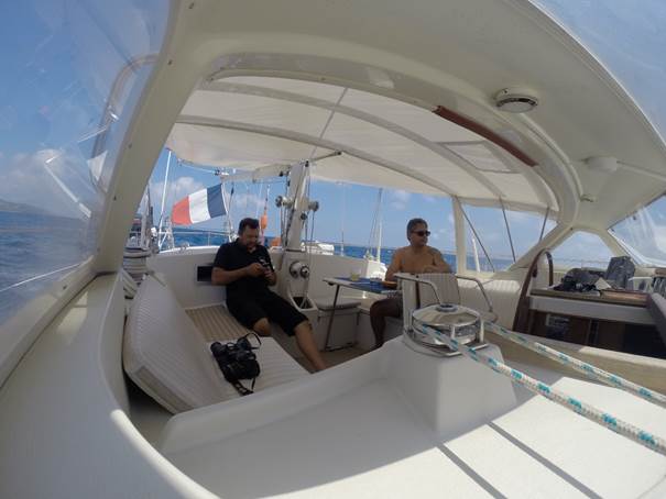 Nous allons notre chemin à bord de l’annexe, moteur à bas régime, afin de respecter l’environnement et de ne pas se prendre une stalactite sur la tronche.