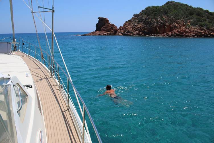 Un peu plus tard, nous arrivons pour le mouillage de midi : petite crique et baignade pour Capo Sud.