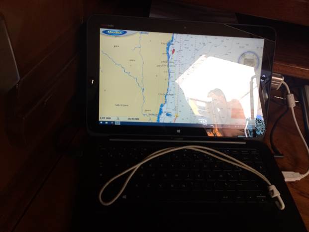 Il est sur le clavier de l’ordi de navigation, avec en fond sur l’écran, la carte de navigation, et Capo Sud en reflet qui prend des photos. Chers lecteurs, ce fameux bitoniau qui pendouillait à l’équipet servait à conserver la porte du frigo ouverte pendant l’hiver pour que ça ne moisisse pas dedans…