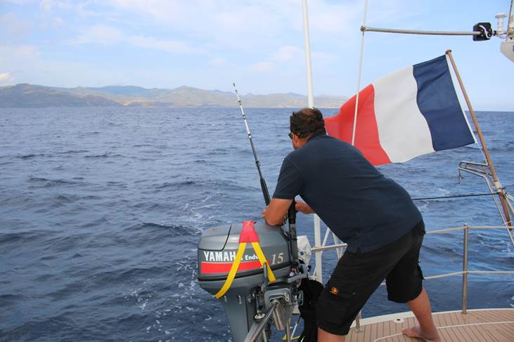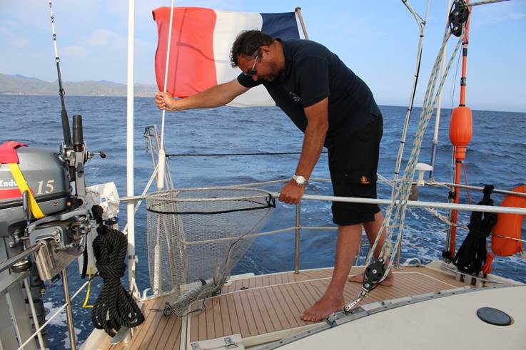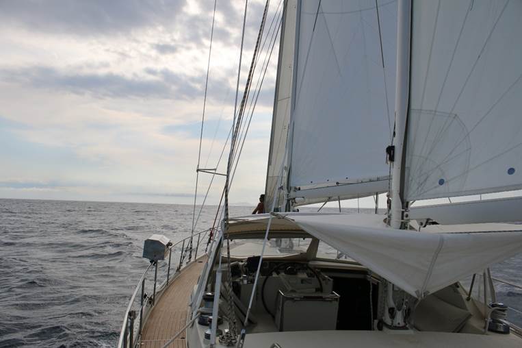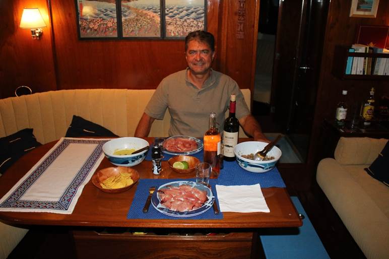 Le repas pris (on l’appelle aussi un Pavu-Papri en papouasie boréale): cabillaud sauté au chorizo et ail émincé sur riz Thaï moelleux, nous appareillons, poussés par le vent thermique de quinze à vingt nœuds qui se lève chaque après-midi en baie de Cagliari.