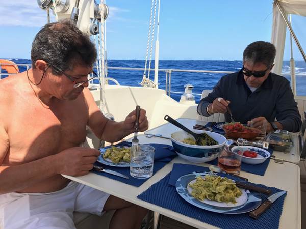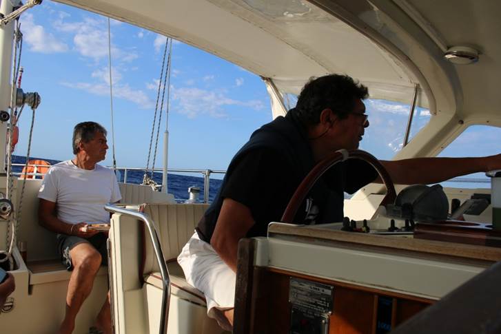 La mer est nettement plus calme : nous quittons la zone d’influence du mistral vers 16h et le vent revient de travers.