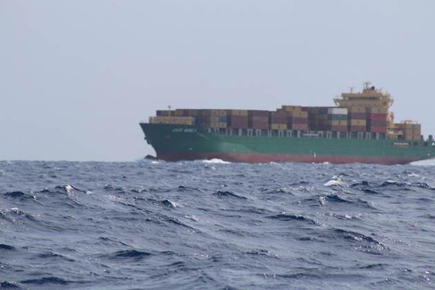 Nous croisons un porte-conteneurs vers 15h30 et il nous faut manœuvrer pour éviter de se faire couper en deux par le navire sur tribord.