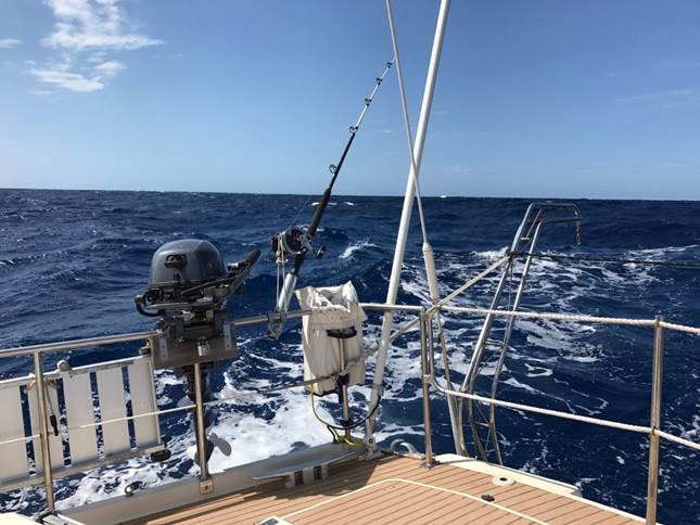 Nous avons mis une canne à l’eau en espérant prendre un thon mais le Rapala s’est fait bouffer…