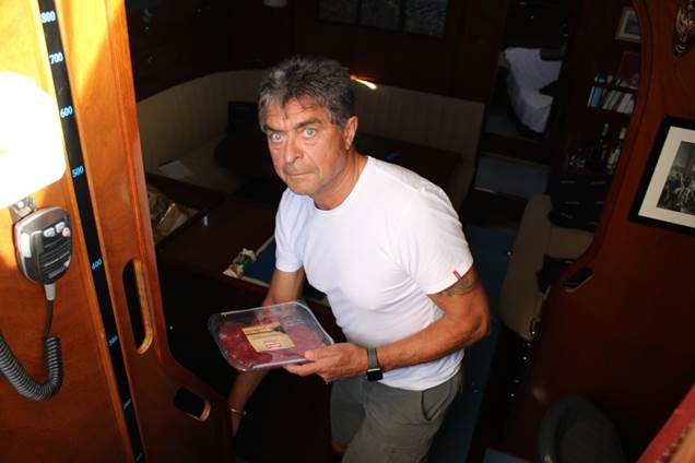 Nous avons mis une canne à l’eau en espérant prendre un thon mais le Rapala s’est fait bouffer…