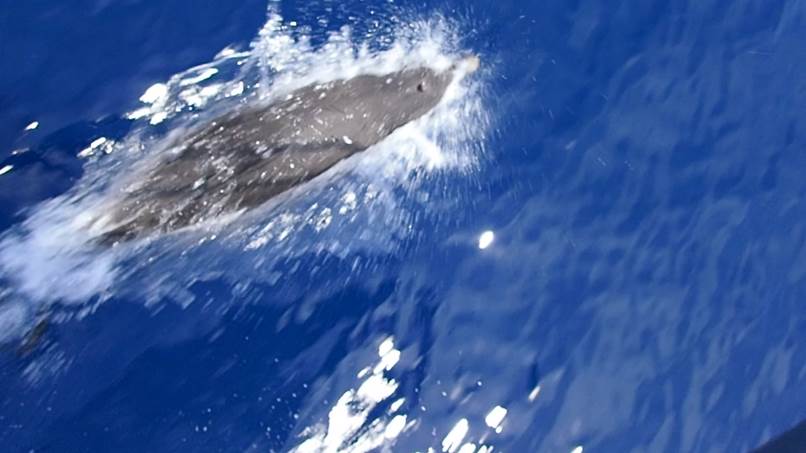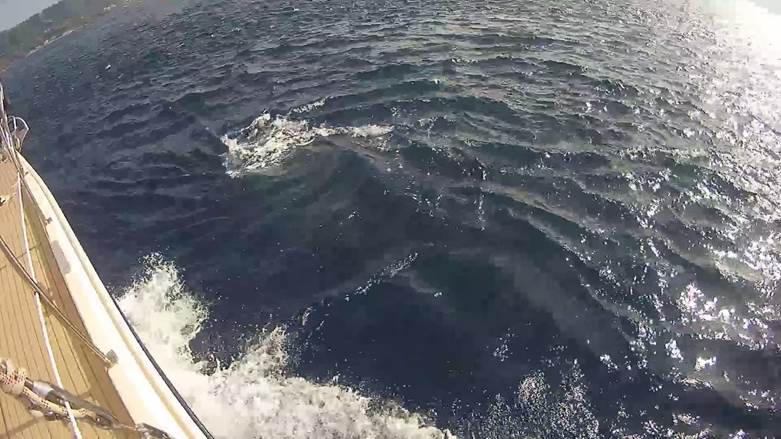 Les dauphins l’ont compris, et viennent nous saluer brièvement. Ils sont 5, 6 à nager dans l’étrave avant de reprendre leur route.