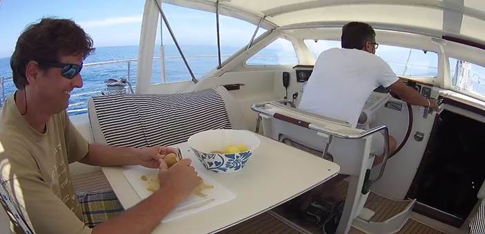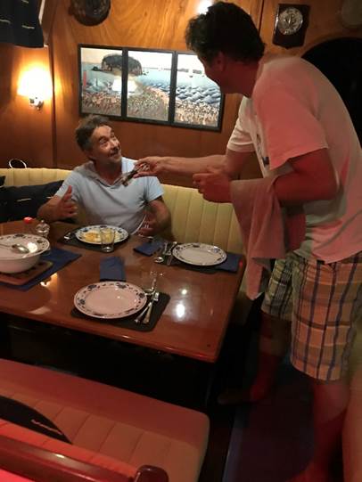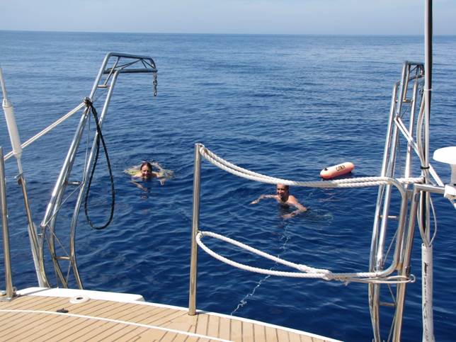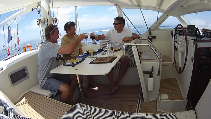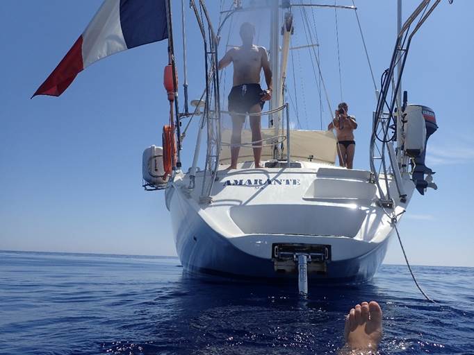 Ayant brillamment géré cette escarmouche guerrière, nous décidons alors de stopper en mer, pour passer à table et fêter dignement l’évènement.
