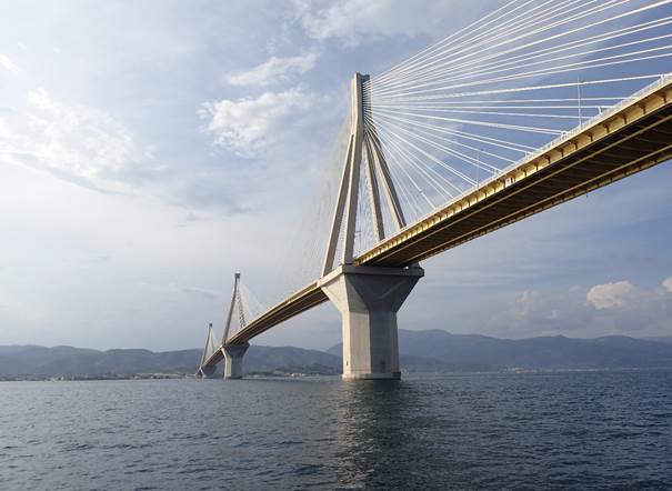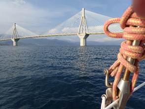 Au loin se dessine le pont de RION, long de 2252 mètres, que nous franchirons vers 18 :00, excités par le passage sous ce pont monumental.