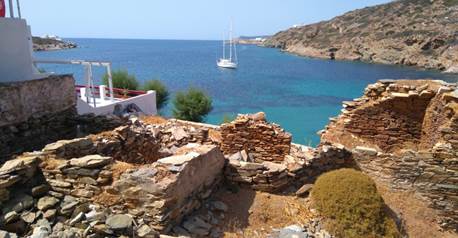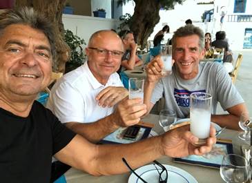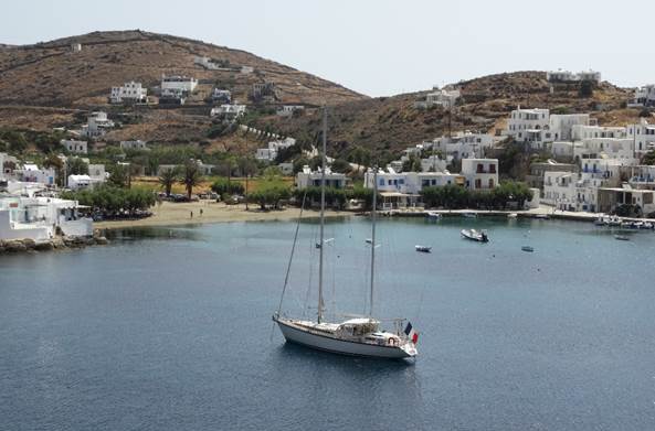 Nous levons l’ancre (après avoir bien levé le coude !) en début d’après-midi puis cap à l’ouest pour Sifnos, avec un vent toujours dans le teston (grrr !).