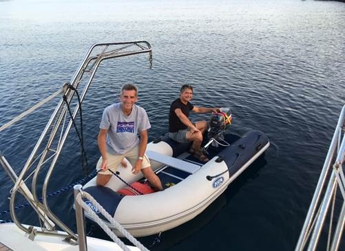 Vers 18h nous embouquons l’entrée de ladite crique et nous restons scotchés par la beauté du site (encore plus beau que la Tour Eiffel !) : un seul voilier au mouillage, qui n’a d’ailleurs pas l’air ravi de notre arrivée (on le comprend), un petit village bien typique de carte postale et une eau transparente.