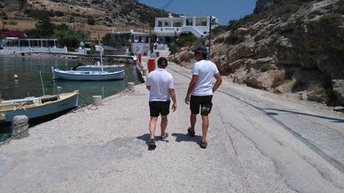 Une cigale de mer accompagnée d’un risotto, des sardines grillées avec des frites maison qui feraient saliver un belge en goguette sans oublier la salade grecque et tout ce qui gravite autour composent notre menu, le tout arrosé par un petit blanc local pas piqué des hannetons !