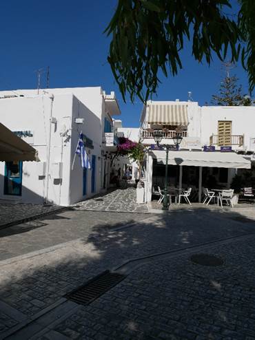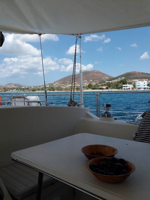 Le repas à peine achevé et la vaisselle rangée, nous sautons dans l’annexe pour une excursion à Naoussa, et l’achat d’un nouveau chapeau pour le cap’tain, le précédent ayant servi d’anémomètre le matin même et n’ayant pas supporté une rafale à 30 nœuds (pb qualité sans doute…)