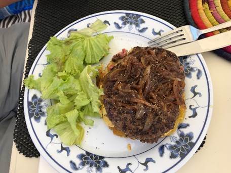 Ici, un haché de boeuf « bourguignon » : galette de pommes de terre râpées en canapé, moutarde de Dijon, steak haché du boucher de Naoussa grillé à cœur (le steack), nappé d’une compotée d’oignons rouges.