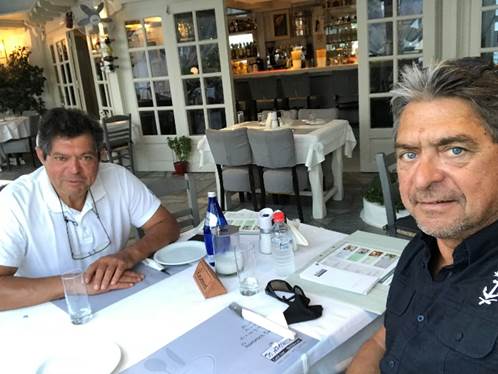 Nous filons à terre avec l’annexe pour faire les dernières courses indispensables : jus de tomates pour Espadon et Ouzo pour Caposud et quelques niama-niamas style-genre « Doritos », olives Kalamata, tzatsiki, taramas, hoummous pour égayer les apéros.