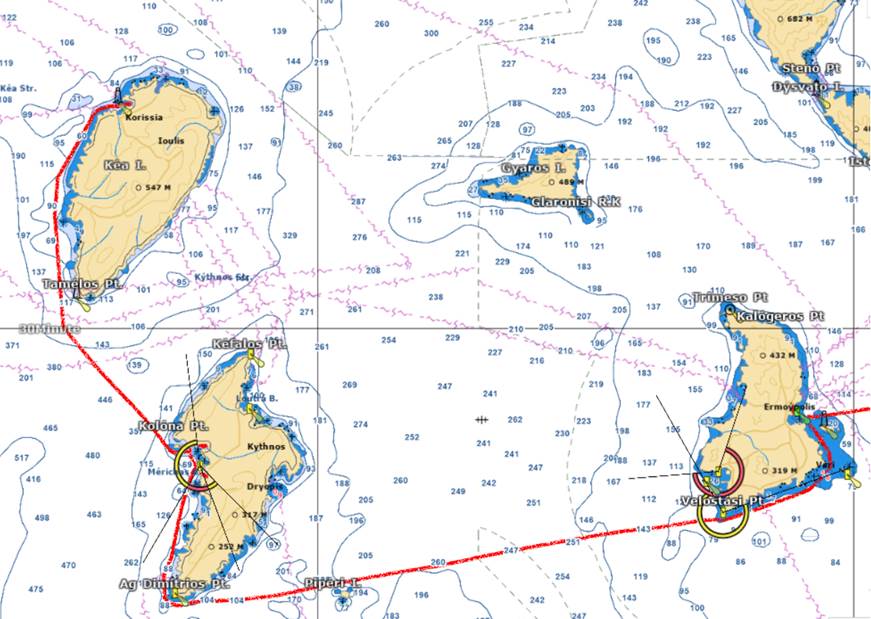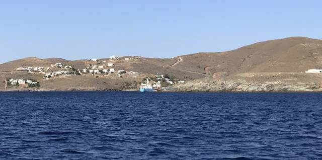 L’ouverture de la baie de Mérichas sur l’île Kythnos se rend visible grâce à un mini-cargo qui nous montre le chemin.