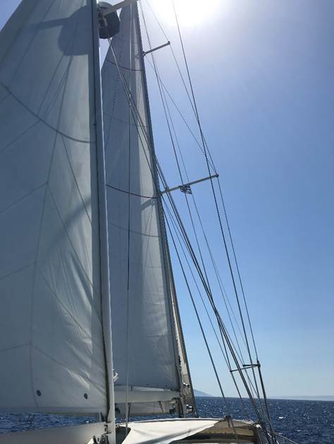 En mer, le vent de nord-ouest, de 20 nœuds, nous propulse gentiment au petit largue.