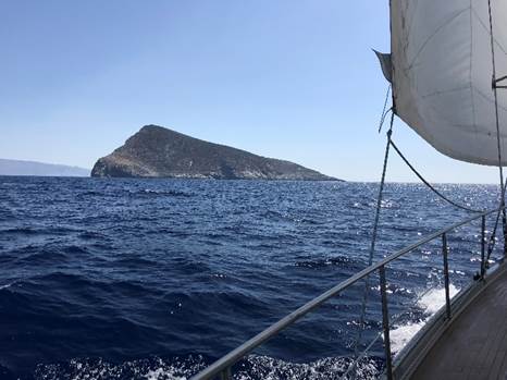 Lîle de Piperi que nous laissons sous le vent, nous rappelle ‘l’Etoile Mystérieuse’ de Hergé.