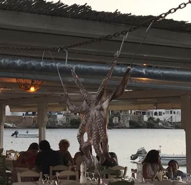 Je ne peux résister à vous extraire de cette photo le détail culinaire du poulpe écartelé qui sert d’enseigne. Il parait qu’il est meilleur préparé après une journée au soleil et trois bouillons.