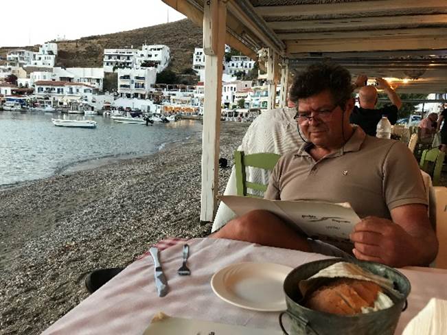 Le fils du patron, un peu pirate, très commercial, nous accueille en son estaminet ( il y en a partout en Grèce, des