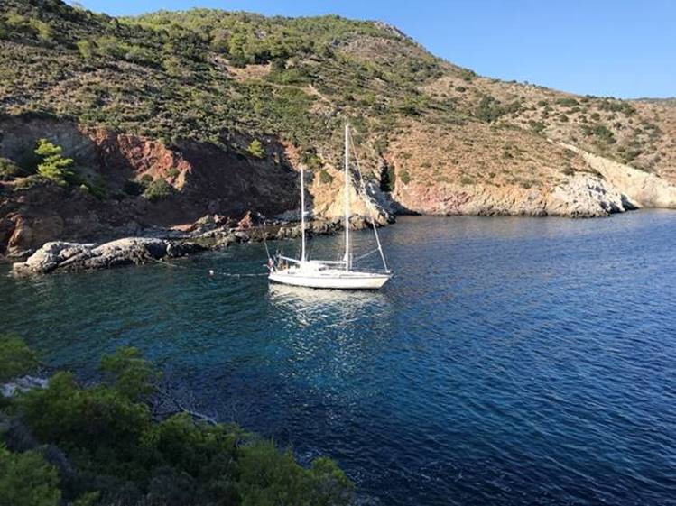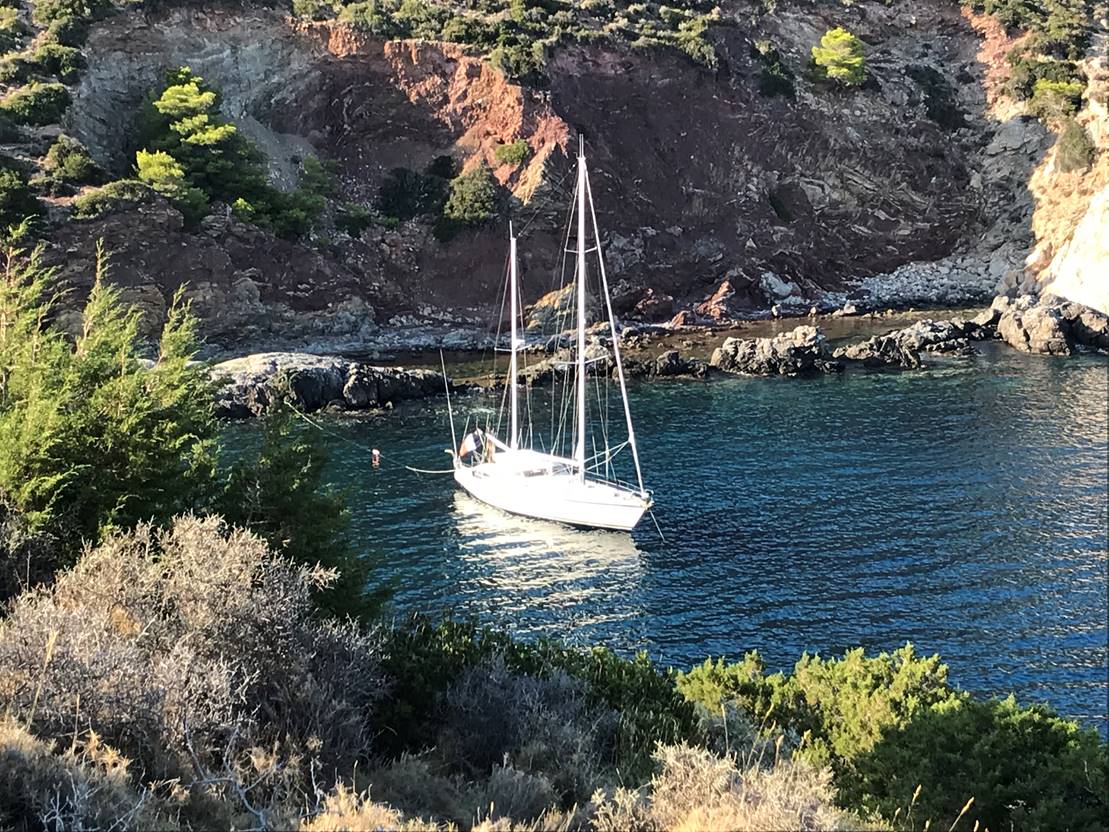 Arrivés à Hydra, nous « tanquons » Amarante au chausse-pied, ancre vers le large et amarre de cul à terre dans une crique ou personne d’autre ne viendra mouiller.