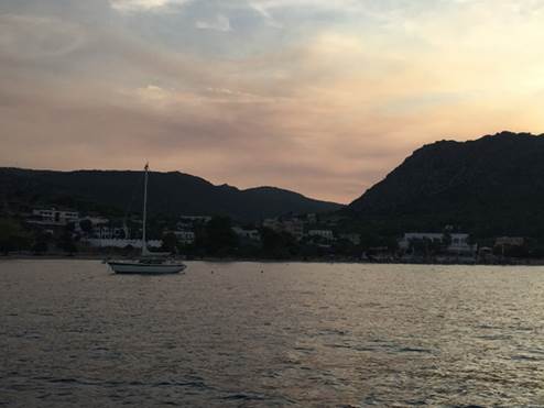 Le mouillage est tranquille sous le ciel chargé des fumées de l’incendie.