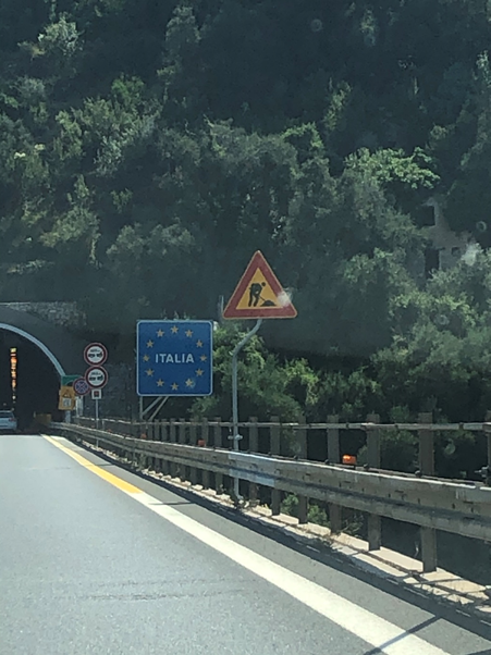 Nous quittons la maison, prenons l’autoroute. Quelques heures de conduite-aire d’autoroute-chips-conduite plus tard, nous passons la frontière italienne, avec la douce sensation d’avoir franchi un premier waypoint (= indication de fin d’étape, changement de cap pour poursuivre la route maritime.)