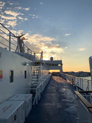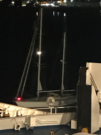 Nous observons la manœuvre de départ depuis un point situé le plus-à-l-avant-possible du ferry, et nous assistons au passage sous l’étrave d’un voilier : un AMEL !!!