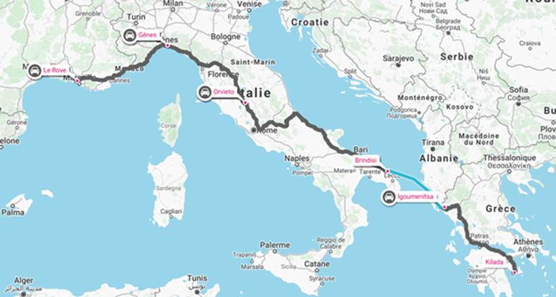 Il est prévu de rejoindre notre cher Amarante par la route en grande partie : il s’agit d’atteindre la frontière italienne depuis Marseille avant de traverser du Nord au Sud en passant par Gênes, jusqu’à Brindisi, le fameux pays botté.