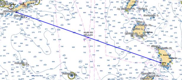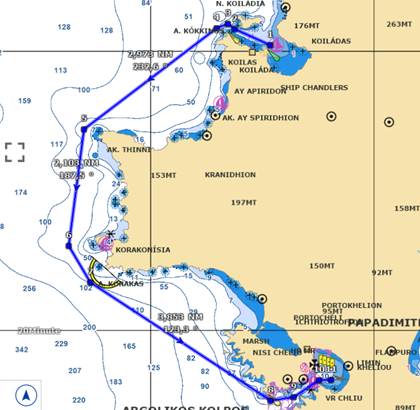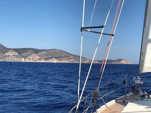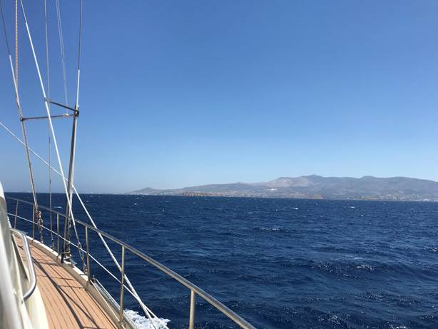 10 heures de traversée avec un vent de Nord-Est qui monte à 25 nœuds dans la mer de Myrto, comme d’habitude, ce qui nous fais une navigation mouvementée avec la mer du vent courte et creuse par le travers.