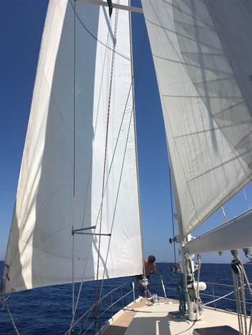 Le peu de vent nous permet de mettre la voile en appui du moteur. On gagne un nœud, et ça fait de l’ombre…