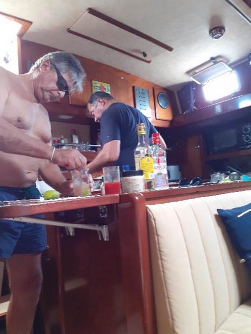 En milieu de matinée, nous gonflons l’annexe et l’équipons de son moteur, puis partons, Barracuda et moi, à son bord, pour évacuer les poubelles et aller ensuite assurer le ravitaillement du bord.